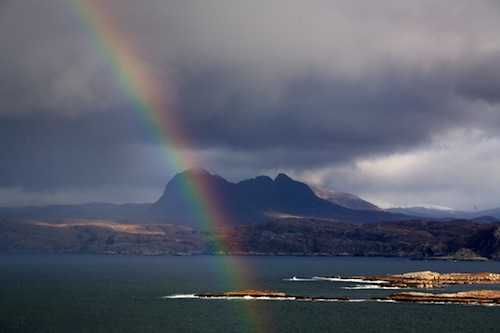 One day, we climbed Stac Pollaidh, a pleasantly challenging ascent followed by a scramble to the cairn at the top, and then we made it down to Achnahaird Bay on the other side. For 10 glorious minutes we looked out across the waves and captured Suilven, framed by cloud, a rainbow arching through the scene – before the rain set in.